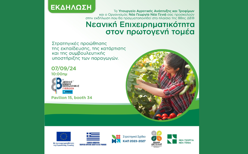 Το Υπουργείο Αγροτικής Ανάπτυξης και Τροφίμων και ο οργανισμός Νέα Γεωργία Νέα Γενιά, σας προσκαλούν στην εκδήλωση που συνδιοργανώνουν στο πλαίσιο της 88ης ΔΕΘ με τίτλο: Νεανική Επιχειρηματικότητα στον πρωτογενή