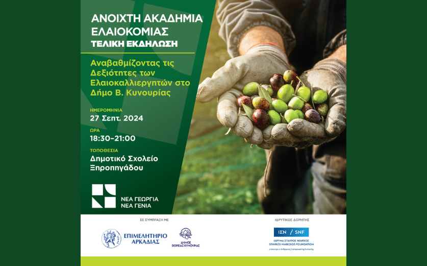 Τελική Εκδήλωση – Πρόγραμμα «Ανοιχτή Ακαδημία Ελαιοκομίας» Αναβαθμίζοντας τις Δεξιότητες των Ελαιοκαλλιεργητών στο Δήμο Β. Κυνουρίας Με επιτυχία ολοκληρώνεται το εκπαιδευτικό πρόγραμμα «Ανοιχτή Ακαδημία Ελαιοκομίας», που υλοποιείται από τον οργανισμό